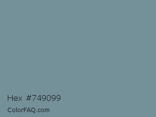 Hex #749099 Color is a normal blue color and the nearest color is Light Slate Gray #778899. Hex code #749099 and RGB value is rgb(116,144,153). In RGB color space, this color is composed of 45% red, 56% green, 60% blue, In CMYK color space, this color is composed of 24% cyan, 6% magenta, 0% yellow , 40% black , In HSL color space, this color has a hue angle of 195° , 15% saturation and 53% lightness.