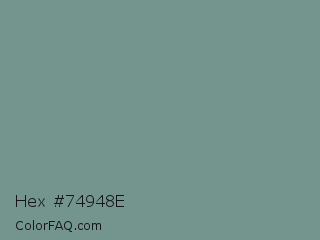 Hex #74948e Color is a normal cyan color and the nearest color is Juniper #6d9292. Hex code #74948e and RGB value is rgb(116,148,142). In RGB color space, this color is composed of 45% red, 58% green, 56% blue, In CMYK color space, this color is composed of 22% cyan, 0% magenta, 4% yellow , 42% black , In HSL color space, this color has a hue angle of 169° , 13% saturation and 52% lightness.