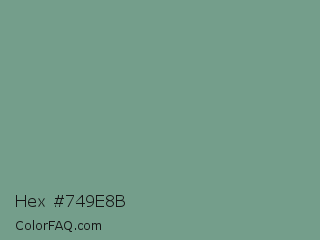 Hex #749e8b Color is a normal green color and the nearest color is Oxley #779e86. Hex code #749e8b and RGB value is rgb(116,158,139). In RGB color space, this color is composed of 45% red, 62% green, 55% blue, In CMYK color space, this color is composed of 27% cyan, 0% magenta, 12% yellow , 38% black , In HSL color space, this color has a hue angle of 153° , 18% saturation and 54% lightness.