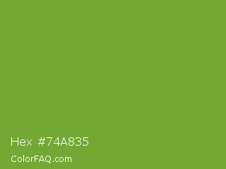 Hex #74a835 Color is a normal green color and the nearest color is Green RYB #66b032. Hex code #74a835 and RGB value is rgb(116,168,53). In RGB color space, this color is composed of 45% red, 66% green, 21% blue, In CMYK color space, this color is composed of 31% cyan, 0% magenta, 68% yellow , 34% black , In HSL color space, this color has a hue angle of 87° , 52% saturation and 43% lightness.