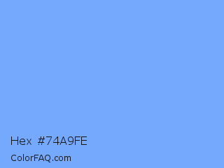 Hex #74a9fe Color is a light blue color and the nearest color is French Sky Blue #77b5fe. Hex code #74a9fe and RGB value is rgb(116,169,254). In RGB color space, this color is composed of 45% red, 66% green, 100% blue, In CMYK color space, this color is composed of 54% cyan, 33% magenta, 0% yellow , 0% black , In HSL color space, this color has a hue angle of 217° , 99% saturation and 73% lightness.
