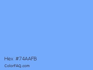 Hex #74aafb Color is a light blue color and the nearest color is French Sky Blue #77b5fe. Hex code #74aafb and RGB value is rgb(116,170,251). In RGB color space, this color is composed of 45% red, 67% green, 98% blue, In CMYK color space, this color is composed of 54% cyan, 32% magenta, 0% yellow , 2% black , In HSL color space, this color has a hue angle of 216° , 94% saturation and 72% lightness.