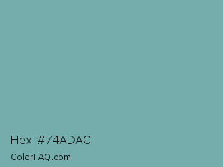 Hex #74adac Color is a normal cyan color and the nearest color is Green Sheen #6eaea1. Hex code #74adac and RGB value is rgb(116,173,172). In RGB color space, this color is composed of 45% red, 68% green, 67% blue, In CMYK color space, this color is composed of 33% cyan, 0% magenta, 1% yellow , 32% black , In HSL color space, this color has a hue angle of 179° , 26% saturation and 57% lightness.