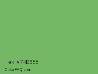 Hex #74b866 Color is a normal green color and the nearest color is Bud Green #7bb661. Hex code #74b866 and RGB value is rgb(116,184,102). In RGB color space, this color is composed of 45% red, 72% green, 40% blue, In CMYK color space, this color is composed of 37% cyan, 0% magenta, 45% yellow , 28% black , In HSL color space, this color has a hue angle of 110° , 37% saturation and 56% lightness.