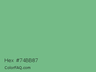 Hex #74bb87 Color is a normal green color and the nearest color is De York #7ac488. Hex code #74bb87 and RGB value is rgb(116,187,135). In RGB color space, this color is composed of 45% red, 73% green, 53% blue, In CMYK color space, this color is composed of 38% cyan, 0% magenta, 28% yellow , 27% black , In HSL color space, this color has a hue angle of 136° , 34% saturation and 59% lightness.