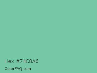 Hex #74c8a6 Color is a light green color and the nearest color is Gulf Stream #80b3ae. Hex code #74c8a6 and RGB value is rgb(116,200,166). In RGB color space, this color is composed of 45% red, 78% green, 65% blue, In CMYK color space, this color is composed of 42% cyan, 0% magenta, 17% yellow , 22% black , In HSL color space, this color has a hue angle of 156° , 43% saturation and 62% lightness.