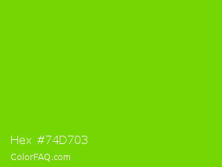 Hex #74d703 Color is a normal green color and the nearest color is Alien Armpit #84de02. Hex code #74d703 and RGB value is rgb(116,215,3). In RGB color space, this color is composed of 45% red, 84% green, 1% blue, In CMYK color space, this color is composed of 46% cyan, 0% magenta, 99% yellow , 16% black , In HSL color space, this color has a hue angle of 88° , 97% saturation and 43% lightness.