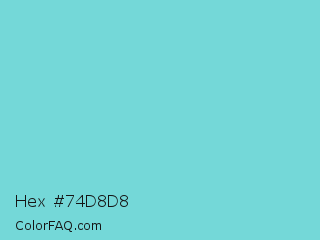 Hex #74d8d8 Color is a light cyan color and the nearest color is Aquamarine Blue #71d9e2. Hex code #74d8d8 and RGB value is rgb(116,216,216). In RGB color space, this color is composed of 45% red, 85% green, 85% blue, In CMYK color space, this color is composed of 46% cyan, 0% magenta, 0% yellow , 15% black , In HSL color space, this color has a hue angle of 180° , 56% saturation and 65% lightness.