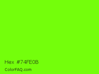 Hex #74fe0b Color is a normal green color and the nearest color is Lawn Green #7cfc00. Hex code #74fe0b and RGB value is rgb(116,254,11). In RGB color space, this color is composed of 45% red, 100% green, 4% blue, In CMYK color space, this color is composed of 54% cyan, 0% magenta, 96% yellow , 0% black , In HSL color space, this color has a hue angle of 94° , 99% saturation and 52% lightness.