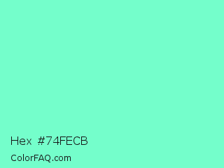Hex #74fecb Color is a light green color and the nearest color is Aquamarine #7fffd4. Hex code #74fecb and RGB value is rgb(116,254,203). In RGB color space, this color is composed of 45% red, 100% green, 80% blue, In CMYK color space, this color is composed of 54% cyan, 0% magenta, 20% yellow , 0% black , In HSL color space, this color has a hue angle of 158° , 99% saturation and 73% lightness.