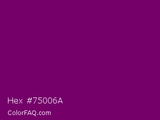 Hex #75006a Color is a dark magenta color and the nearest color is Patriarch #800080. Hex code #75006a and RGB value is rgb(117,0,106). In RGB color space, this color is composed of 46% red, 0% green, 42% blue, In CMYK color space, this color is composed of 0% cyan, 100% magenta, 9% yellow , 54% black , In HSL color space, this color has a hue angle of 306° , 100% saturation and 23% lightness.