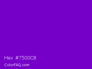 Hex #7500c8 Color is a normal purple color and the nearest color is French Violet #8806ce. Hex code #7500c8 and RGB value is rgb(117,0,200). In RGB color space, this color is composed of 46% red, 0% green, 78% blue, In CMYK color space, this color is composed of 42% cyan, 100% magenta, 0% yellow , 22% black , In HSL color space, this color has a hue angle of 275° , 100% saturation and 39% lightness.