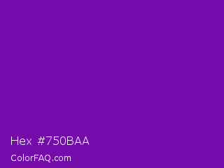 Hex #750baa Color is a normal purple color and the nearest color is Violet RYB #8601af. Hex code #750baa and RGB value is rgb(117,11,170). In RGB color space, this color is composed of 46% red, 4% green, 67% blue, In CMYK color space, this color is composed of 31% cyan, 94% magenta, 0% yellow , 33% black , In HSL color space, this color has a hue angle of 280° , 88% saturation and 35% lightness.