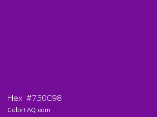 Hex #750c98 Color is a normal purple color and the nearest color is Purple #660099. Hex code #750c98 and RGB value is rgb(117,12,152). In RGB color space, this color is composed of 46% red, 5% green, 60% blue, In CMYK color space, this color is composed of 23% cyan, 92% magenta, 0% yellow , 40% black , In HSL color space, this color has a hue angle of 285° , 85% saturation and 32% lightness.