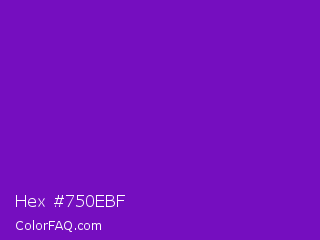 Hex #750ebf Color is a normal purple color and the nearest color is French Violet #8806ce. Hex code #750ebf and RGB value is rgb(117,14,191). In RGB color space, this color is composed of 46% red, 5% green, 75% blue, In CMYK color space, this color is composed of 39% cyan, 93% magenta, 0% yellow , 25% black , In HSL color space, this color has a hue angle of 275° , 86% saturation and 40% lightness.