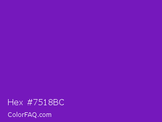 Hex #7518bc Color is a normal purple color and the nearest color is Purple Heart Crayola #652dc1. Hex code #7518bc and RGB value is rgb(117,24,188). In RGB color space, this color is composed of 46% red, 9% green, 74% blue, In CMYK color space, this color is composed of 38% cyan, 87% magenta, 0% yellow , 26% black , In HSL color space, this color has a hue angle of 274° , 77% saturation and 42% lightness.