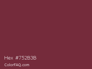 Hex #752b3b Color is a normal red color and the nearest color is Wine #722f37. Hex code #752b3b and RGB value is rgb(117,43,59). In RGB color space, this color is composed of 46% red, 17% green, 23% blue, In CMYK color space, this color is composed of 0% cyan, 63% magenta, 50% yellow , 54% black , In HSL color space, this color has a hue angle of 347° , 46% saturation and 31% lightness.