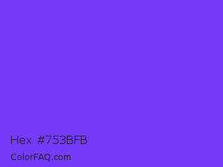 Hex #753bfb Color is a light indigo color and the nearest color is Blue Violet #8a2be2. Hex code #753bfb and RGB value is rgb(117,59,251). In RGB color space, this color is composed of 46% red, 23% green, 98% blue, In CMYK color space, this color is composed of 53% cyan, 76% magenta, 0% yellow , 2% black , In HSL color space, this color has a hue angle of 258° , 96% saturation and 61% lightness.