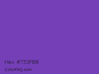 Hex #753fb8 Color is a normal violet color and the nearest color is Studio #714ab2. Hex code #753fb8 and RGB value is rgb(117,63,184). In RGB color space, this color is composed of 46% red, 25% green, 72% blue, In CMYK color space, this color is composed of 36% cyan, 66% magenta, 0% yellow , 28% black , In HSL color space, this color has a hue angle of 267° , 49% saturation and 48% lightness.