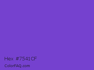 Hex #7541cf Color is a normal violet color and the nearest color is Slate Blue #6a5acd. Hex code #7541cf and RGB value is rgb(117,65,207). In RGB color space, this color is composed of 46% red, 25% green, 81% blue, In CMYK color space, this color is composed of 43% cyan, 69% magenta, 0% yellow , 19% black , In HSL color space, this color has a hue angle of 262° , 60% saturation and 53% lightness.