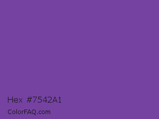 Hex #7542a1 Color is a normal purple color and the nearest color is Royal Purple #6b3fa0. Hex code #7542a1 and RGB value is rgb(117,66,161). In RGB color space, this color is composed of 46% red, 26% green, 63% blue, In CMYK color space, this color is composed of 27% cyan, 59% magenta, 0% yellow , 37% black , In HSL color space, this color has a hue angle of 272° , 42% saturation and 45% lightness.