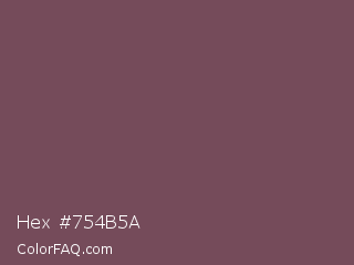 Hex #754b5a Color is a normal rose color and the nearest color is Ferra #704f50. Hex code #754b5a and RGB value is rgb(117,75,90). In RGB color space, this color is composed of 46% red, 29% green, 35% blue, In CMYK color space, this color is composed of 0% cyan, 36% magenta, 23% yellow , 54% black , In HSL color space, this color has a hue angle of 339° , 22% saturation and 38% lightness.