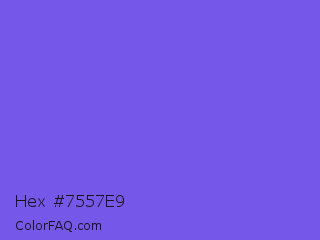 Hex #7557e9 Color is a light indigo color and the nearest color is Medium Slate Blue #7b68ee. Hex code #7557e9 and RGB value is rgb(117,87,233). In RGB color space, this color is composed of 46% red, 34% green, 91% blue, In CMYK color space, this color is composed of 50% cyan, 63% magenta, 0% yellow , 9% black , In HSL color space, this color has a hue angle of 252° , 77% saturation and 63% lightness.