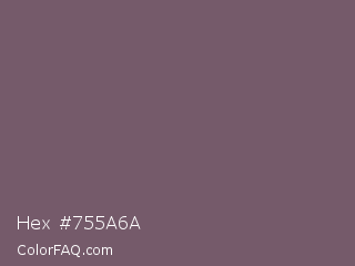 Hex #755a6a Color is a normal magenta color and the nearest color is Falcon #7f626d. Hex code #755a6a and RGB value is rgb(117,90,106). In RGB color space, this color is composed of 46% red, 35% green, 42% blue, In CMYK color space, this color is composed of 0% cyan, 23% magenta, 9% yellow , 54% black , In HSL color space, this color has a hue angle of 324° , 13% saturation and 41% lightness.