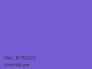 Hex #755cd1 Color is a normal indigo color and the nearest color is Slate Blue #6a5acd. Hex code #755cd1 and RGB value is rgb(117,92,209). In RGB color space, this color is composed of 46% red, 36% green, 82% blue, In CMYK color space, this color is composed of 44% cyan, 56% magenta, 0% yellow , 18% black , In HSL color space, this color has a hue angle of 253° , 56% saturation and 59% lightness.
