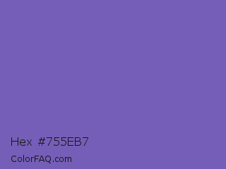 Hex #755eb7 Color is a normal indigo color and the nearest color is Fuchsia Blue #7a58c1. Hex code #755eb7 and RGB value is rgb(117,94,183). In RGB color space, this color is composed of 46% red, 37% green, 72% blue, In CMYK color space, this color is composed of 36% cyan, 49% magenta, 0% yellow , 28% black , In HSL color space, this color has a hue angle of 256° , 38% saturation and 54% lightness.