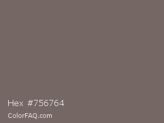 Hex #756764 Color is a normal red color and the nearest color is Flint #6f6a61. Hex code #756764 and RGB value is rgb(117,103,100). In RGB color space, this color is composed of 46% red, 40% green, 39% blue, In CMYK color space, this color is composed of 0% cyan, 12% magenta, 15% yellow , 54% black , In HSL color space, this color has a hue angle of 11° , 8% saturation and 43% lightness.