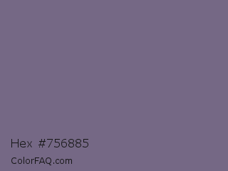 Hex #756885 Color is a normal violet color and the nearest color is Rum #796989. Hex code #756885 and RGB value is rgb(117,104,133). In RGB color space, this color is composed of 46% red, 41% green, 52% blue, In CMYK color space, this color is composed of 12% cyan, 22% magenta, 0% yellow , 48% black , In HSL color space, this color has a hue angle of 267° , 12% saturation and 46% lightness.