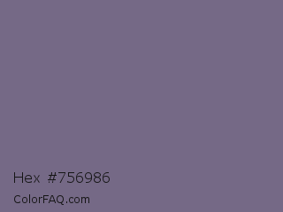 Hex #756986 Color is a normal violet color and the nearest color is Rum #796989. Hex code #756986 and RGB value is rgb(117,105,134). In RGB color space, this color is composed of 46% red, 41% green, 53% blue, In CMYK color space, this color is composed of 13% cyan, 22% magenta, 0% yellow , 47% black , In HSL color space, this color has a hue angle of 265° , 12% saturation and 47% lightness.
