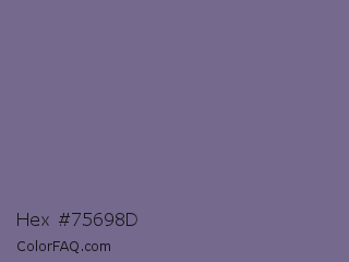 Hex #75698d Color is a normal indigo color and the nearest color is Rum #796989. Hex code #75698d and RGB value is rgb(117,105,141). In RGB color space, this color is composed of 46% red, 41% green, 55% blue, In CMYK color space, this color is composed of 17% cyan, 26% magenta, 0% yellow , 45% black , In HSL color space, this color has a hue angle of 260° , 15% saturation and 48% lightness.