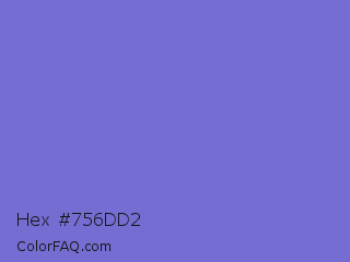 Hex #756dd2 Color is a light indigo color and the nearest color is Moody Blue #7f76d3. Hex code #756dd2 and RGB value is rgb(117,109,210). In RGB color space, this color is composed of 46% red, 43% green, 82% blue, In CMYK color space, this color is composed of 44% cyan, 48% magenta, 0% yellow , 18% black , In HSL color space, this color has a hue angle of 245° , 53% saturation and 63% lightness.