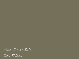 Hex #75705a Color is a normal yellow color and the nearest color is Crocodile #736d58. Hex code #75705a and RGB value is rgb(117,112,90). In RGB color space, this color is composed of 46% red, 44% green, 35% blue, In CMYK color space, this color is composed of 0% cyan, 4% magenta, 23% yellow , 54% black , In HSL color space, this color has a hue angle of 49° , 13% saturation and 41% lightness.