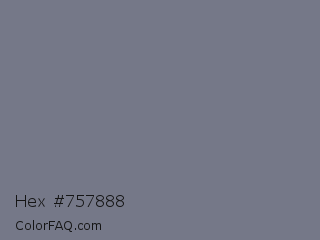 Hex #757888 Color is a normal blue color and the nearest color is Raven #727b89. Hex code #757888 and RGB value is rgb(117,120,136). In RGB color space, this color is composed of 46% red, 47% green, 53% blue, In CMYK color space, this color is composed of 14% cyan, 12% magenta, 0% yellow , 47% black , In HSL color space, this color has a hue angle of 231° , 8% saturation and 50% lightness.