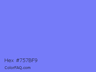 Hex #757bf9 Color is a light blue color and the nearest color is Medium Slate Blue #7b68ee. Hex code #757bf9 and RGB value is rgb(117,123,249). In RGB color space, this color is composed of 46% red, 48% green, 98% blue, In CMYK color space, this color is composed of 53% cyan, 51% magenta, 0% yellow , 2% black , In HSL color space, this color has a hue angle of 237° , 92% saturation and 72% lightness.