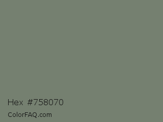Hex #758070 Color is a normal green color and the nearest color is Smoke #738276. Hex code #758070 and RGB value is rgb(117,128,112). In RGB color space, this color is composed of 46% red, 50% green, 44% blue, In CMYK color space, this color is composed of 9% cyan, 0% magenta, 13% yellow , 50% black , In HSL color space, this color has a hue angle of 101° , 7% saturation and 47% lightness.