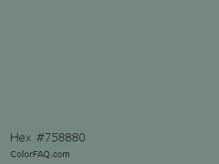 Hex #758880 Color is a normal green color and the nearest color is Blue Smoke #748881. Hex code #758880 and RGB value is rgb(117,136,128). In RGB color space, this color is composed of 46% red, 53% green, 50% blue, In CMYK color space, this color is composed of 14% cyan, 0% magenta, 6% yellow , 47% black , In HSL color space, this color has a hue angle of 155° , 8% saturation and 50% lightness.