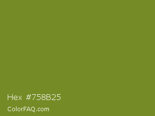 Hex #758b25 Color is a normal lime color and the nearest color is Wasabi #788a25. Hex code #758b25 and RGB value is rgb(117,139,37). In RGB color space, this color is composed of 46% red, 55% green, 15% blue, In CMYK color space, this color is composed of 16% cyan, 0% magenta, 73% yellow , 45% black , In HSL color space, this color has a hue angle of 73° , 58% saturation and 35% lightness.