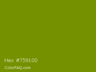 Hex #759100 Color is a dark lime color and the nearest color is Limeade #6f9d02. Hex code #759100 and RGB value is rgb(117,145,0). In RGB color space, this color is composed of 46% red, 57% green, 0% blue, In CMYK color space, this color is composed of 19% cyan, 0% magenta, 100% yellow , 43% black , In HSL color space, this color has a hue angle of 72° , 100% saturation and 28% lightness.