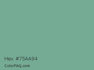 Hex #75aa94 Color is a normal green color and the nearest color is Bay Leaf #7da98d. Hex code #75aa94 and RGB value is rgb(117,170,148). In RGB color space, this color is composed of 46% red, 67% green, 58% blue, In CMYK color space, this color is composed of 31% cyan, 0% magenta, 13% yellow , 33% black , In HSL color space, this color has a hue angle of 155° , 24% saturation and 56% lightness.
