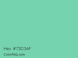 Hex #75d3af Color is a light green color and the nearest color is Medium Aquamarine #66ddaa. Hex code #75d3af and RGB value is rgb(117,211,175). In RGB color space, this color is composed of 46% red, 83% green, 69% blue, In CMYK color space, this color is composed of 45% cyan, 0% magenta, 17% yellow , 17% black , In HSL color space, this color has a hue angle of 157° , 52% saturation and 64% lightness.