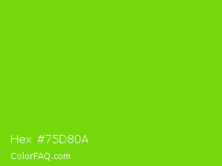 Hex #75d80a Color is a normal green color and the nearest color is Alien Armpit #84de02. Hex code #75d80a and RGB value is rgb(117,216,10). In RGB color space, this color is composed of 46% red, 85% green, 4% blue, In CMYK color space, this color is composed of 46% cyan, 0% magenta, 95% yellow , 15% black , In HSL color space, this color has a hue angle of 89° , 91% saturation and 44% lightness.