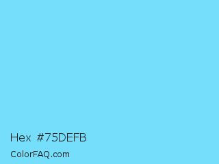 Hex #75defb Color is a light cyan color and the nearest color is Spray #79deec. Hex code #75defb and RGB value is rgb(117,222,251). In RGB color space, this color is composed of 46% red, 87% green, 98% blue, In CMYK color space, this color is composed of 53% cyan, 12% magenta, 0% yellow , 2% black , In HSL color space, this color has a hue angle of 193° , 94% saturation and 72% lightness.