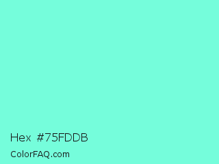 Hex #75fddb Color is a light cyan color and the nearest color is Aquamarine #7fffd4. Hex code #75fddb and RGB value is rgb(117,253,219). In RGB color space, this color is composed of 46% red, 99% green, 86% blue, In CMYK color space, this color is composed of 54% cyan, 0% magenta, 13% yellow , 1% black , In HSL color space, this color has a hue angle of 165° , 97% saturation and 73% lightness.