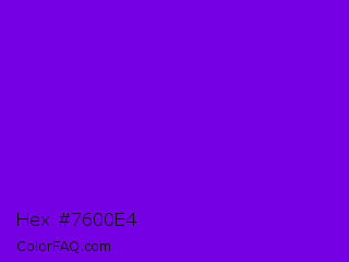 Hex #7600e4 Color is a normal purple color and the nearest color is Electric Indigo #6f00ff. Hex code #7600e4 and RGB value is rgb(118,0,228). In RGB color space, this color is composed of 46% red, 0% green, 89% blue, In CMYK color space, this color is composed of 48% cyan, 100% magenta, 0% yellow , 11% black , In HSL color space, this color has a hue angle of 271° , 100% saturation and 45% lightness.