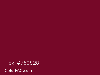 Hex #760828 Color is a dark rose color and the nearest color is Burgundy #800020. Hex code #760828 and RGB value is rgb(118,8,40). In RGB color space, this color is composed of 46% red, 3% green, 16% blue, In CMYK color space, this color is composed of 0% cyan, 93% magenta, 66% yellow , 54% black , In HSL color space, this color has a hue angle of 343° , 87% saturation and 25% lightness.