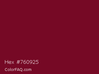 Hex #760925 Color is a dark red color and the nearest color is Burgundy #800020. Hex code #760925 and RGB value is rgb(118,9,37). In RGB color space, this color is composed of 46% red, 4% green, 15% blue, In CMYK color space, this color is composed of 0% cyan, 92% magenta, 69% yellow , 54% black , In HSL color space, this color has a hue angle of 345° , 86% saturation and 25% lightness.